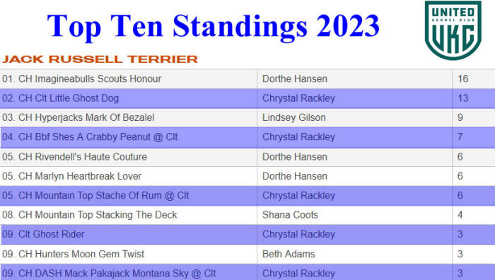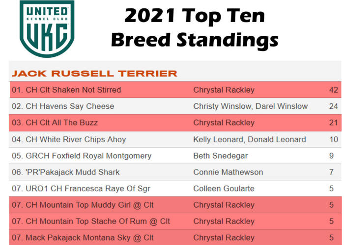UKC Champions = 24 UKC Grand Champion = 9 UKC United Weight Puller = 1 UKC Top Ten Ranking = 12x Multi UKC Terrier Group Placements UKC Best in Show = 1 UKC Reserve Best in Show = 1 UKC Dash = 1 |