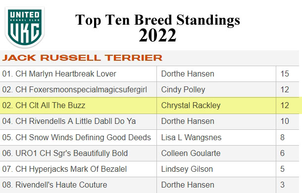 AKC Grand Champion = 3 AKC Champion = 8 AKC NOHSB = 1 AKC CM Title = 2 AKC Best in Show Misc. = 6x AKC Terrier Group Placement = 2 AKC Top Ranking = 2x AKC National Qualifiers = 4x AKC FastCAT = 2x |